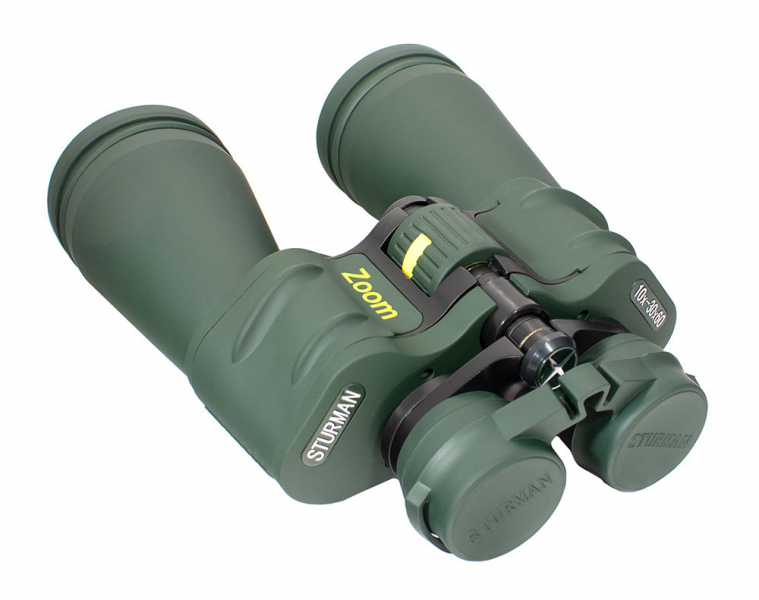 Благодаря особенностям конструкции бинокль Sturman 10-30x60 позволяет вести наблюдения за протяжёнными или движущимися объектами, оставаясь на одном месте. Нужно только изменить кратность (в диапазоне от 10х до 30 х) с помощью специального рычажкового механизма и объект снова будет в поле Вашего зрения. При смене увеличения меняется значение таких параметров как диаметр выходного зрачка, светосила и поле зрения.