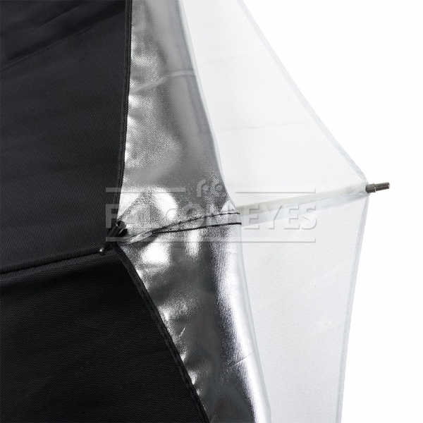 Фотозонт Falcon Eyes URK-60TSB1 Falcon Eyes URK-60TSB1 – комбинированный зонт 2 в 1: просветный/серебристый. Диаметр 122 см. Просветный зонт покрыт белой полупрозрачной тканью. Световой поток от вспышки попадает на ткань зонта, максимально рассеивается и, увеличивая площадь излучения, равномерно освещает объект съемки. Таким образом, резкий точечный свет, излучаемый при срабатывании фотовспышки, преобразуется в достаточно мягкий световой поток, излучаемый с большей площади. Серебристая поверхность зонта дает более жесткий, по сравнению с белыми зонтами, свет, что позволяет получать контрастное изображение с четкими тенями. Два зонта можно использовать совместно для получения более яркого света чем при использовании просвечивающей поверхности, но более мягкого, чем при использовании серебристой. Прочные эластичные спицы из стекловолокна и соединительные элементы из ударопрочного пластика для долговечного использования - спицы не ржавеют, сохраняют форму на протяжении всего срока эксплуатации, устойчивы к механическим воздействиям. Ткань из полиэстера обладает высокой износостойкостью.