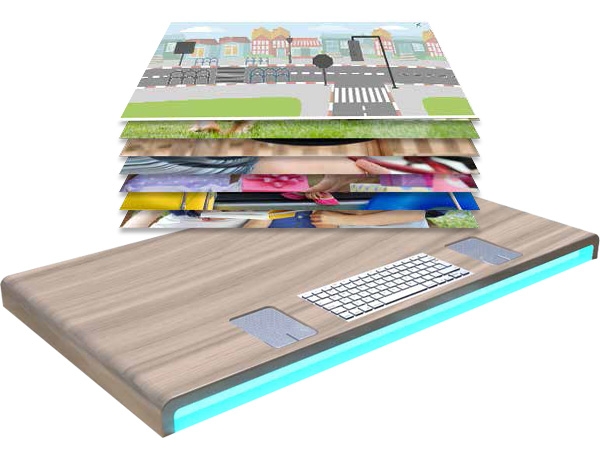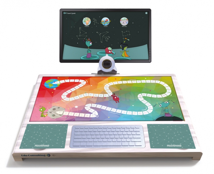 • Интерактивный рабочий стол. Интерактивный стол с уникальным дизайном MultiMind стимулирует групповые занятия и поощряет детей к командной работе. Стол оснащен удобной клавиатурой и двумя пультами управления, а так же камерой для распознавания различных дидактических материалов и действий детей.