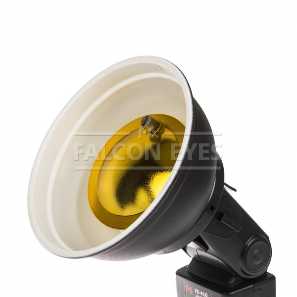• дефлектор — 3 шт. (белый, серебристый и золотой), превращает рефлектор в портретную тарелку, изготовлен из металла, применяется для смягчения светового потока, формирует умеренные по глубине и жесткости тени, благодаря этому часто применяется в портретной съемке.