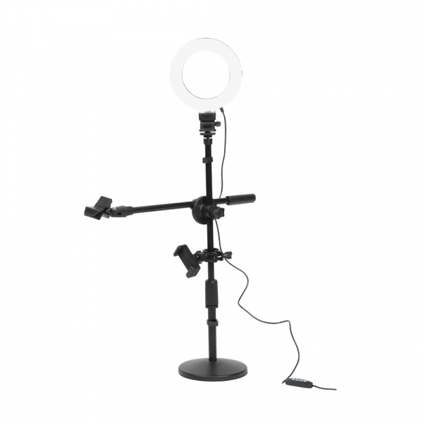 Комплектный бестеневой кольцевой осветитель установлен на телескопическую штангу через наклонно-поворотный кронштейн и подключается к любому источнику питания с портом USB. Осветитель снабжен регулировкой яркости и цветовой температуры. Внешний диаметр осветителя — 165 мм. Внутренний диаметр кольца — 110 мм. Количество светодиодов — 72 шт. Высота центральной штанги для осветителя регулируется от 39 до 52 см и фиксируется цанговым зажимом. Для фиксации кабеля питания на стойке предусмотрены две пластиковых клипсы.