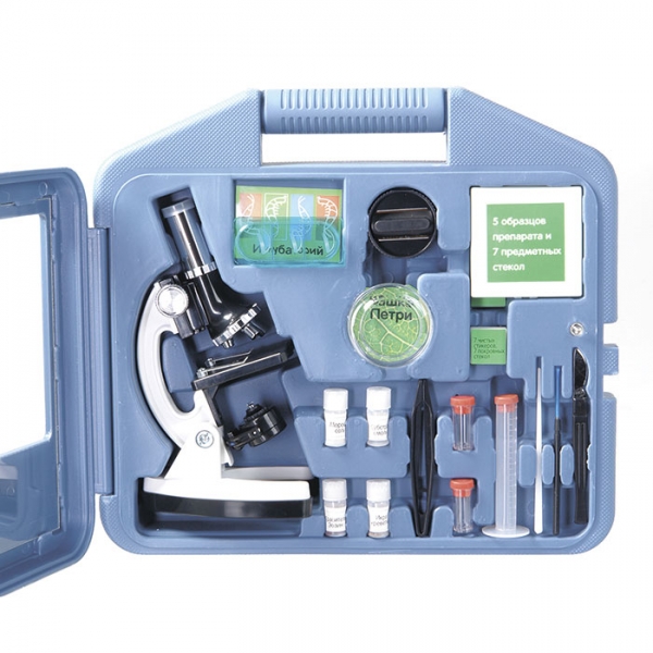 Микроскоп Микромед 100x-900x в кейсе Этот микроскоп с увеличением 100х — 400х — 900х не просто подарок для юного биолога. Это реальный прибор, рассчитанный на длительный срок службы и на интенсивную и интересную «эксплуатацию». Никакой «хлипкости», присущей пластиковым моделям! Если вы настроились на объект и хотите показать его ребенку (или наоборот), будьте уверены — убирая одну руку с ручки фокусировки, а другую с основания микроскопа (вы его придерживаете) фокусировка не собьется и подстройка не потребуется. Удобная система освещения — зеркало и лампочка (на обратной стороне зеркала, включается автоматически при перевороте зеркала). Четыре фильтра и диафрагмы (кольцо на предметном столике) сделают освещение исследуемого объекта наиболее выигрышным для наблюдений. В комплекте масса принадлежностей. Не только инструментов (включая микротом — специальный нож для резки препаратов), но и инкубатор для опытов и сами препараты. Как выращивать живые микроорганизмы подробно описано в инструкции. Главное — не слишком увлечься опытами самому. Все-таки это игрушка для детей, а у вас есть свои — компьютер, смартфон и другие гаджеты. И последнее. Микроскоп, инструменты, препараты упакованы в жесткий подарочный кейс из двойного пластика. Это важно при переездах на дачу или в гости. И микроскоп лежит в ячейке и не будет поврежден, и препараты не перепутаются.Микроскоп имеет металлические основание и держатель тубуса, а подвижная часть (тубус с объективами и окуляром) удобно управляется большой ручкой, которая вращается плавно, с некоторым усилием, без люфтов и мертвого хода.