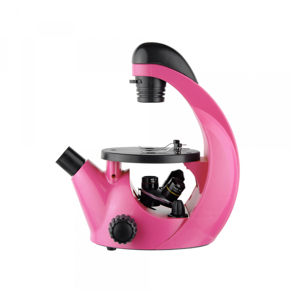 Основное отличие инвертированных (перевернутых) микроскопов от прямых в том, что объективы расположены снизу под объектом наблюдения, а осветительный конденсор сверху. Такая конструкция микроскопа значительно расширяет возможности проведения научных исследований. Можно исследовать биологические объекты зафиксированные на предметном стекле, изучать биокультуры непосредственно в стеклянной лабораторной посуде с питательной средой, наблюдая за развитием культур через стеклянное дно посуды, наблюдать результаты химических реакции в стеклянной лабораторной посуде (чашки Петри, колбы). Микроскоп можно применять при проведении школьных лабораторных работ в области ботаники, биологии и химии. Так же это идеальный инструмент для проведения исследований в домашних условиях и может стать отличным подарком ребенку.