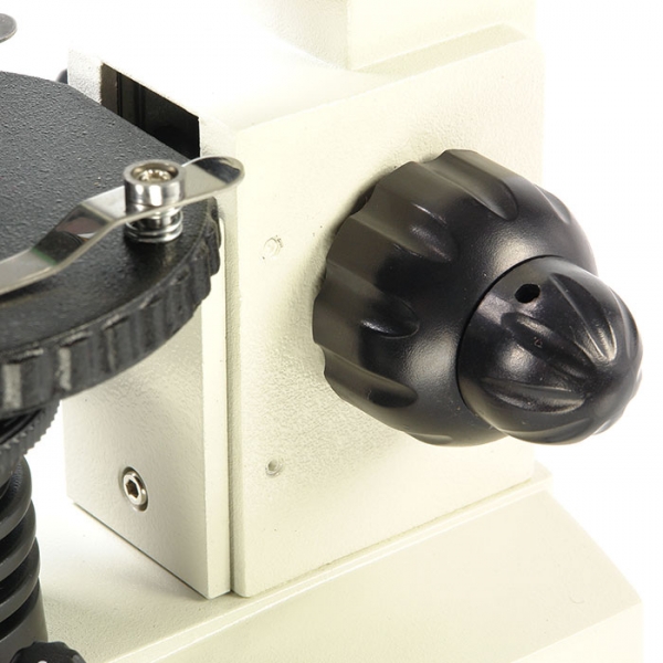 • Рукоятки грубой и тонкой фокусировки, расположенные по обеим сторонам штатива, обеспечивают точную настройку резкости изображения на большом увеличении. Рукоятки расположены на одной оси. Такая комфортная система фокусировки отличает этот микроскоп от других школьных моделей.