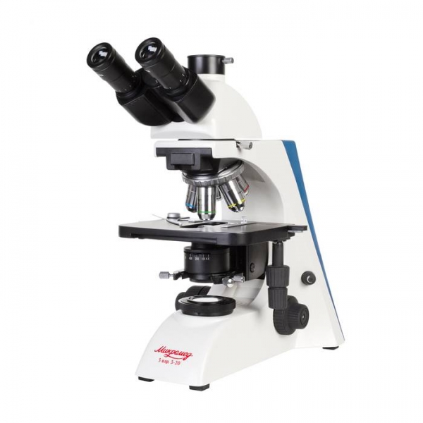 Тринокулярный микроскоп МИКРОМЕД 3 вар. 3-20 М предназначен для наблюдения и морфологических исследований препаратов в проходящем свете по методу светлого поля, а также по методу темного поля, фазового контраста и в поляризованном свете в комплекте с соответствующими устройствами, поставляемыми по дополнительному заказу. Микроскоп может быть использован в различных областях медицины, в биологии, ботанике, химии и других областях науки. Используется при диагностических исследованиях в клиниках и больницах, а также для учебных целей в высших учебных заведениях. На микроскопе можно изучать окрашенные и неокрашенные объекты в виде мазков и срезов. Конструкция тринокулярной визуальной насадки микроскопа позволяет выводить изображение в режиме реального времени на экран ПК с помощью видеоокуляра (в комплект не входит). Видеоокуляр устанавливается в специальный выход — канал визуализации. Это позволяет одновременно наблюдать изображение через окуляры микроскопа и на экране ПК. Микроскоп рассчитан на длину тубуса «бесконечность», объективы стандарта DIN, парфокальная высота объективов 45 мм.