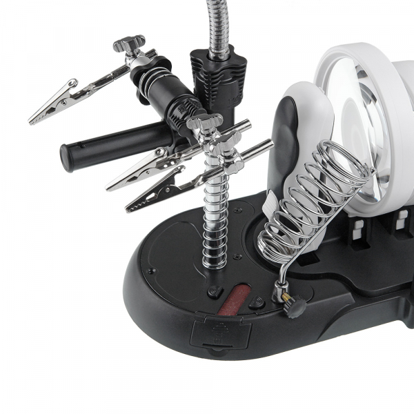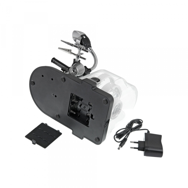 Основание-база выполнена из АБС-пластика. На верхней передней части базы расположена металлическая накладка с закреплённой на ней держателем паяльника и металлическим стержнем с гибкой штангой. Тут же расположена и подпружиненная площадка с абразивной бумагой для чистки жала паяльника (для смены «наждачки» необходимо открыть защитную крышку с правой стороны базы). На задней части базы расположены держатели для луп, ручки и защитного колпака. Батарейный отсек (на четыре батарейки АА, в комплект не входят) находится на нижней части базы под защитной крышкой. Гнездо адаптера питания (адаптер в комплекте) находится с обратной стороны базы. Купить лупу Veber рекомендуется приобрести для проведения ремонтных работ в микроэлектронике, ювелирном деле, миниатюристам, сборщикам моделей и пр.
