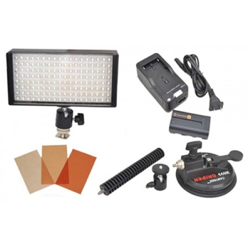 В комплекте с накамерным светом поставляются встроенный держатель аккумулятора, аккумулятор 7,5 v с зарядным устройством, альбом-кейс с гелевыми фильтрами, присоска для установки камеры на транспортное средство.