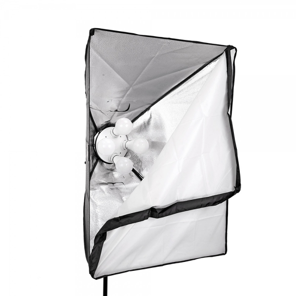 Корпус осветителя на 4 патрона стандарта Е27. На задней панели находятся два переключателя, каждый из которых управляет функцией включения/выключения для двух ламп, расположенных по периметру. Осветитель питается от сети 220 В и имеет стандартный разъем для установки на стойки с креплением 5/8". Осветитель можно использовать самостоятельно или вместе с софтбоксом 60х80 см из комплекта поставки.