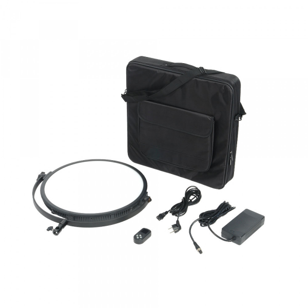 Мощный светодиодный осветитель GreenBean MoonLight 400 LED bi-color - круглая световая панель с изменяемой цветовой температурой. Источники света — 1280 ярких SMD светодиодов с высоким уровнем цветопередачи (CRI более 95). Максимальная мощность — 230 Вт. В отличие от традиционно используемых софтбоксов, осветитель GreenBean MoonLight имеет абсолютно круглую матовую (через которую не видны излучающие светодиоды) поверхность, малые габариты и может создавать красивые круглые блики на глянцевых отражающих поверхностях. В осветителе используется две группы светодиодов с температурой 3200 К и 5600 К, каждая номинальной мощностью 200 Вт. Электрическая схема блока питания осветителя ограничивает общую мощность световой панели величиной 200 Вт. Установив (зафиксировав) необходимую мощность панели (максимум 200 Вт), пользователь может плавно менять цветовую температуру без изменения настроек камеры. Регулировка мощности бесступенчатая — от 10 до 100%