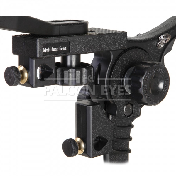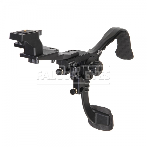 Этот подвижный узел может поворачиваться в пределах 180 градусов, а также передвигаться вдоль по несущей площадке «коромысла» в пределах 25 мм. Выбранное положение фиксируется нижним прижимным винтом. К оси «коромысла» закреплен нижний (подвижный, подпружиненный) изогнутый рычаг — для упора в грудь оператора. Его положение фиксируется любым из двух зажимных винтов — слева и справа от оси. В штативе имеются два посадочных места для установки конструкции на стойку с наконечником 5/8 дюйма (с зажимными винтами и бронзовыми вставками). В комплекте — широкий, мягкий ремень с пластиковым карабином.