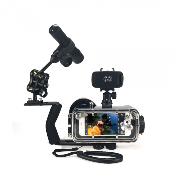 Три штативных гнезда снизу бокса, а также крепление типа "холодный" башмак, позволяет крепить рукоятки и армов для подводных фонарей.