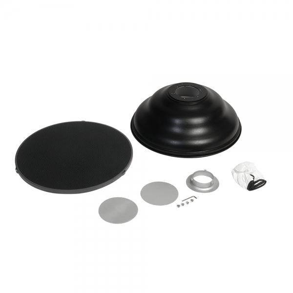 Falcon Eyes SuperSoft SR-60W – это комплект модификатора света, включающий 22-дюймовую белую портретную тарелку с алюминиевым дефлектором, дополнительный перфорированный дефлектор, нейлоновый диффузор, сотовую насадку 60° и кольцо с байонетом Bowens (152 мм).