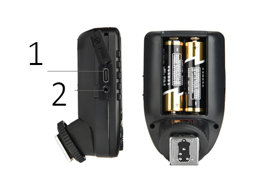 Большой ЖК дисплей, 5 кнопок групп и 4 функциональных кнопки обеспечивают удобство манипуляций. Кнопки групп (1), Функциональные кнопки (2) Обновление прошивки через USB разъем типа С. Беспроводная синхронизация через гнездо для синхрокабеля 2,5мм. USB разъем тип C (1), Гнездо для синхрокабеля 2,5мм (2) *2 батарейки АА Большая портативность Xpro-N – его вес всего 80 г.