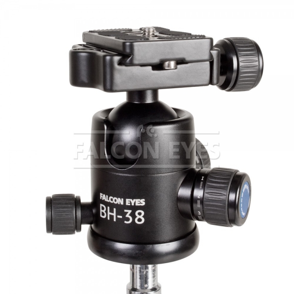 Falcon Eyes ВН-38 — шаровая штативная голова, представляет собой конструкцию из алюминиево-магниевого сплава со стальным полированным шаром и быстросъемной площадкой. Особенностью шаровой головы является возможность контролировать все три оси движения одним замком. Штативная голова ВН-38 изготовлена из алюминиевого сплава, весит 0,4 кг, обладает высокой прочностью и прецизионным исполнением, выдерживает нагрузку до 8 кг. Голову BH-38 можно использовать с любыми штативами, моноподами или другими опорами, имеющими установочный винт диаметром 3/8". Положение площадки с камерой обеспечивает металлический шар, который позволяет моментально зафиксировать камеру в любом положении. Установив усилие зажима на близком к максимальному уровню, вращение шара происходит плавно и без «рывков».