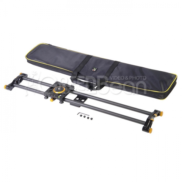 На каретке находится винт диаметром 1/4" (в комплекте переходник 3/8") и отверстия с резьбой диаметром 1/4" и 3/8" для установки вспомогательного оборудования. Сверху на каретке расположен пузырьковый уровень, который поможет выставить слайдер по горизонту. Винтовой фиксатор позволит зафиксировать каретку в определенном положении, а резиновые упоры на торцах каретки предотвратят жесткие удары в крайних положениях.