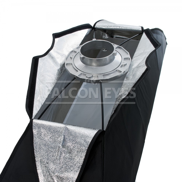 Закрытая конструкция позволяет избежать нежелательных бликов и потерь светового потока. Отражатель, с серебристой тканью внутри, обеспечивает равномерную засветку рассеивателя, который в свою очередь, благодаря большой поверхности, смягчает формируемые тени. Дополнительный внутренний диффузор улучшает равномерность светового потока. Наконечники на упругих металлических спицах не повреждают тканевые спицедержатели софтбокса и облегчают сборку конструкции. В комплекте чехол для хранения.