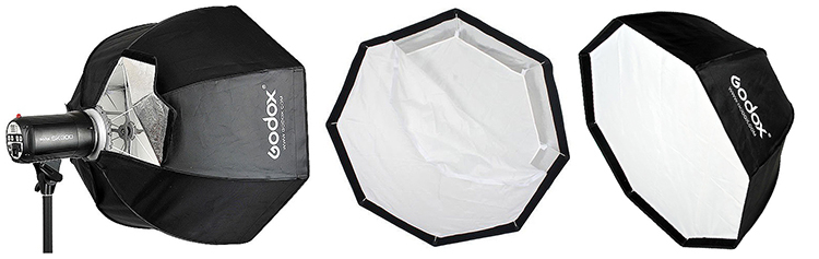 Прямоугольные софтбоксы более удобны с точки зрения занимаемого пространства, восьмиугольную насадку — октобокс — предпочитают использовать в портретной и предметной съемке, когда важна естественная (круглая) форма блика.