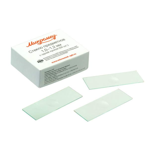 Набор из пятидесяти предметных стекол с 1 лункой Микромед. Толщина стекла 1,0–1,2 мм.