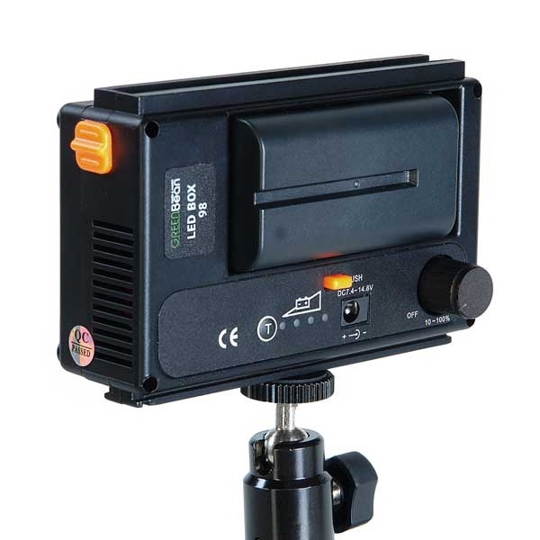 GreenBean LED BOX 98 представляет собой плоский источник света с расположенными по всей площади 98 яркими светодиодами. Прибор воспроизводит мягкий и яркий пучок света с цветовой температурой 5600К (дневной свет), в комплекте фильтр 3200К (лампа накаливания). Компактный и легкий корпус с тонкой рамкой. Толщина корпуса всего 50 мм (с установленными аккумуляторами), благодаря этому его можно использовать там, где будет трудно разместить обычный осветитель. Сверху и снизу на корпусе находятся салазки с фиксаторами, для соединения нескольких приборов GreenBean LED BOX 98 в группу. Конверсионный и рассеивающий фильтры, фиксируются с помощью магнитных защелок и значительно расширяют возможности осветителя. Малое энергопотребление и тепловыделение обеспечат экономичную и комфортную работу. Постоянная яркость сохраняется даже при низком заряде аккумулятора. Цифровой контроллер работающий по методу широтно-импульсной модуляции (многоступенчатое диммирование без мерцания в выбранном положении) позволяет регулировать яркость прибора от 10 до 100%. В комплект входит: аккумулятор емкостью 2200 мАч, зарядное устройство, сетевой адаптер питания, кронштейн с шаровой головкой и посадочными разъемами «башмак» и 1/4", фильтр понижающий цветовую температуру (3200К), матовый рассеивающий фильтр, удобная сумка-чехол с ручкой и жесткими стенками. Емкости аккумулятора хватит примерно на 150 минут автономной работы, на панели управления находится кнопка индикации заряда батареи. Осветитель может работать от сетевого или автомобильного адаптера питания из комплекта.