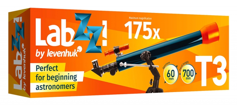 Телескоп Levenhuk LabZZ T3 – детский телескоп со «взрослыми» возможностями. Его увеличение достигает 175 крат, что позволяет исследовать множество астрономических объектов во всех деталях. А управление настолько простое, что с ним справится даже совсем юный исследователь космоса. Все необходимые аксессуары для наблюдений уже включены в комплект поставки. Телескоп Levenhuk LabZZ T3 познакомит юного астронома с космосом и сможет показать ему планеты Солнечной системы, Луну, далекие галактики и загадочные туманности. С помощью диагонального зеркала и оборачивающего окуляра маленький исследователь сможет переключиться на изучение наземных объектов. Оба аксессуара правильно ориентируют изображение телескопа, а оборачивающий окуляр еще и увеличивает его кратность. Линза Барлоу 3х также усиливает оптические возможности телескопа. Азимутальная монтировка, на которую установлен телескоп, легка в управлении. Ребенок освоится с ней всего за несколько минут. Алюминиевая тренога устойчива и надежна, а высоту ее ножек можно регулировать. На треногу можно установить удобный лоток для аксессуаров.