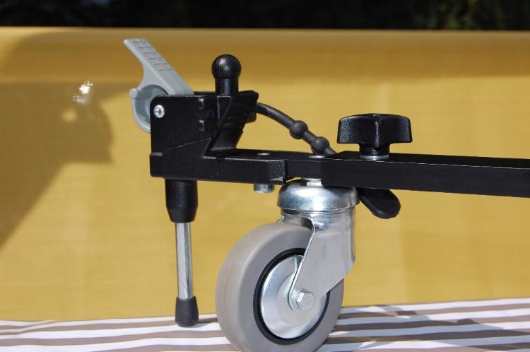 Портативная тележка для штативов. Разработана для легких и средних штативов, имеет возможность изменять длину растяжек, благодаря чему, подходит для всех моделей серии 055, 190, МТ и других. Тележка оснащена 76-мм колесами с функцией безопасной блокировки – при нажатии на своеобразные тормоза на колесах, они приподнимаются от поверхности. При этом тележка остается стоять на отдельных дополнительных ножках. Тележка подходит как для стандартных ножек, штативов, так и для оснащенных шипами. Штативная голова может быть установлена непосредственно в центр тележки, без штатива. Складная. Штативная головка может быть установлена непосредственно в центр тележки.