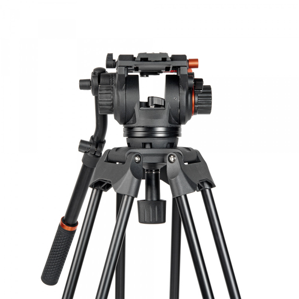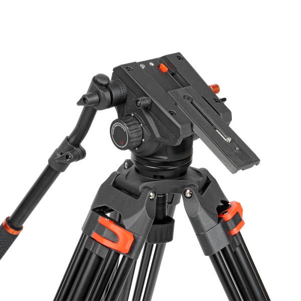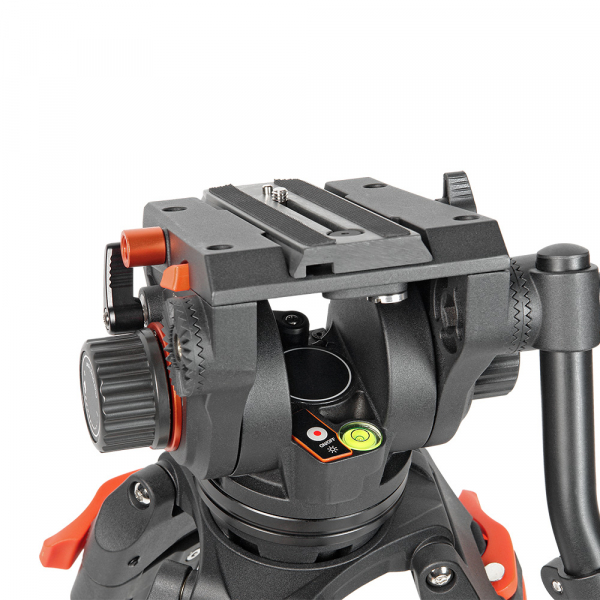 Съёмная голова с жидкостным демпфированием и системой постоянного контрбаланса поворачивается на 360˚ по горизонтали, наклоняется на углы от -60° до +90°, имеет независимые фиксаторы панорамирования, четырёхсекционный регулятор контрбаланса и бесступенчатый регулятор вертикального демпфирования. Голова изготовлена из алюминиево-магниевого сплава. Благодаря жидкостному демпфированию все движения происходят плавно и без рывков. Дополнительно голова оснащена предохранителем площадки, кнопка которого находится на левой стороне. Также на левой стороне головы есть отверстие с системной резьбой 3/8“ для установки дополнительного оборудования или, в зависимости от резьбы на вашей камере, можно ввернуть «лишний» винт для исключения его потери. Винтовое крепление головки к штативу выполнено из стали. На быстросъёмной площадке (стандарт Manfrotto) предусмотрены винты c резьбой 1/4" и 3/8“ (входят в комплект), подпружиненный штифт и противоскользящая вставка. Площадку можно смещать вперёд и назад и фиксировать в выбранном положении. Размер площадки — 50 х 140 мм.