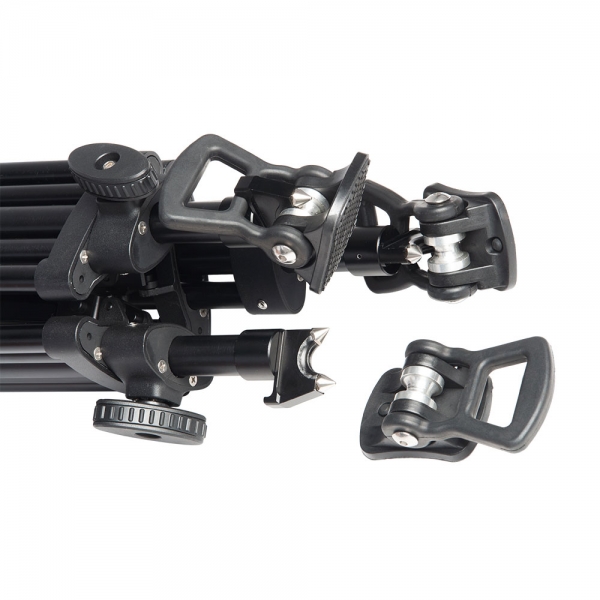 Алюминиевая тренога с 2-х коленным выдвижением, раскладной средней растяжкой и 100 мм шаровой опорой обеспечивает высокую стабильность и предлагает расширенный диапазон высоты установки камеры – от 830 мм до 1780 мм. Все узлы ног и растяжки выполнены из металла, это обеспечивает надежность и долговечность эксплуатации.