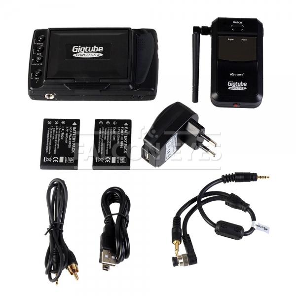 Видоискатель Aputure Gigtube Wireless II GWII-C3 позволяет дистанционно передавать изображение с матрицы фотоаппарата на удаленный до 100 м беспроводной монитор и управлять затвором камеры. Данная версия видоискателя позволяет также управлять режимом видеосъемки (старт/стоп)*. Передатчик из комплекта GWII-C3 предназначен для Canon 1D Mark IV, 7D, 60D, 600D, 550D, 500D, 1100D (возможно использование с другими камерами, соответствующий кабель приобретается отдельно). Устанавливается в горячий башмак камеры, соединяется с камерой с помощью проводов из комплекта. Передача графических данных осуществляется через помехозащищенный радиоканал с частотой 2,4 ГГц. Данная версия передатчика оборудована встроенной видеокамерой для работы с DSLR камерами, не имеющими функции Live View. Приемник Aputure Gigtube Wireless II принимает сигнал на расстоянии до 100 м (на открытом пространстве), 4 радиоканала позволяют работать с четырьмя камерами (необходимо иметь четыре передатчика, приобретаются отдельно). Частичное нажатие на двухпозиционную кнопку активизирует автофокус, полное нажатие производит фотографирование. Дисплей с диагональю 3,5 дюйма, разрешением 320х240 пикселей и цветопередачей в 16 миллионов цветов, защищен быстросъемной блендой. Приемник с ЖК экраном оборудован видеовыходом, который позволит вывести изображение практически на любой внешний монитор или телевизор с разъемом RCA ("тюльпан").